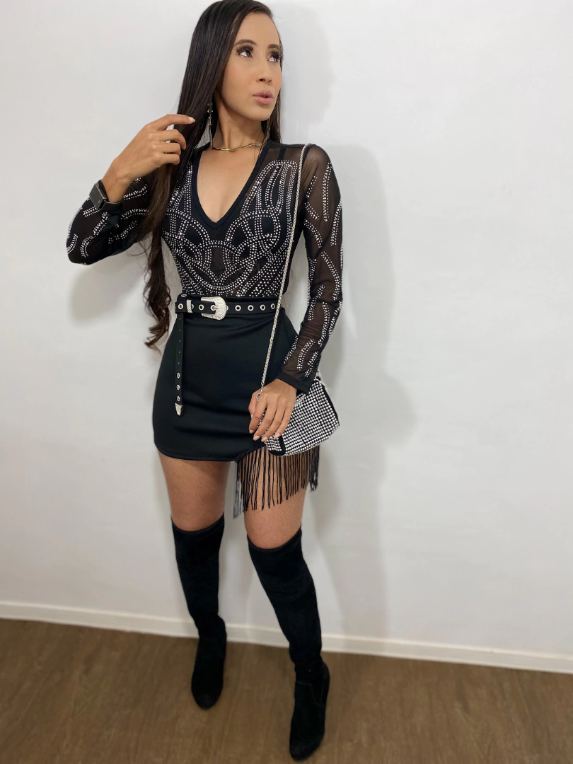 O tecido da saia é de composição de 92% poliamida e 8% elastano.